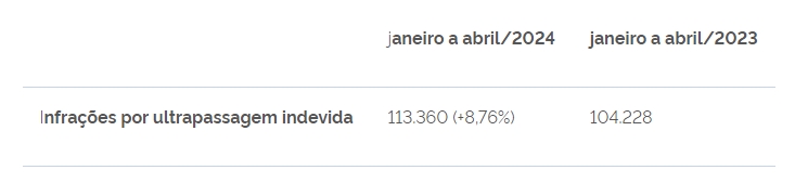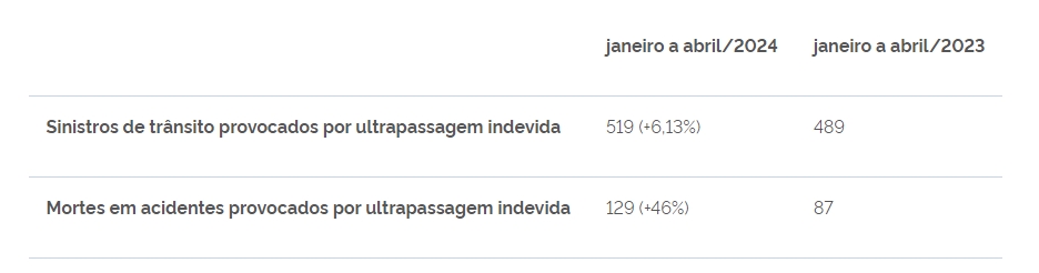 Entre janeiro e abril de 2024, as ultrapassagens indevidas resultaram em 113.360 infrações. Em comparação ao mesmo período do ano passado, quando foram registradas 104.228 autuações, o índice representa aumento de 8,76%. Os sinistros de trânsito provocados pelas manobras irregulares também tiveram alta no mesmo período.