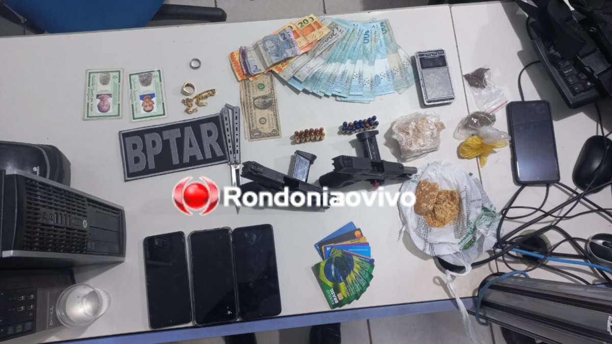 Os acusados foram abordados em um imóvel no condomínio. Com eles foram apreendidas uma pistola calibre 9mm, uma calibre 380, várias porções de cocaína e maconha, aproximadamente R$ 3 mil em dinheiro e uma motocicleta Honda Biz onde foi encontrada parte da droga no baú.