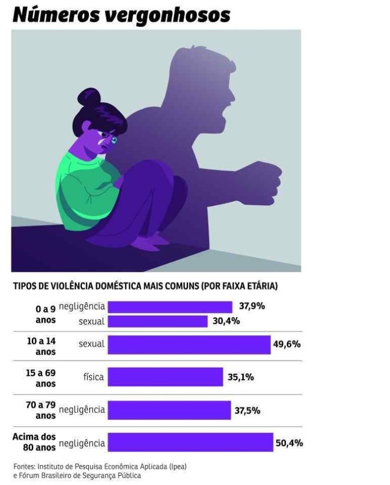 "Se tivéssemos que descrever a experiência de ser uma mulher no Brasil, poderíamos dizer que na primeira infância a negligência é a forma mais comum de violência, com pais e mães como principais autores em igual proporção. A partir dos 10 até os 14 anos, essas meninas são principalmente vítimas de violência sexual, geralmente cometida por pais e padrastos. Dos 15 aos 69 anos, a violência física causada por pais, padrastos, namorados ou maridos é predominante entre as mulheres", descreve o Atlas da Violência.