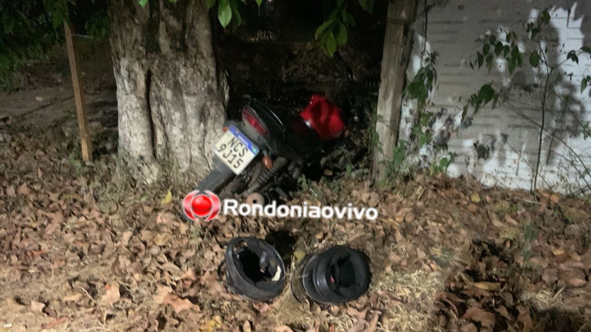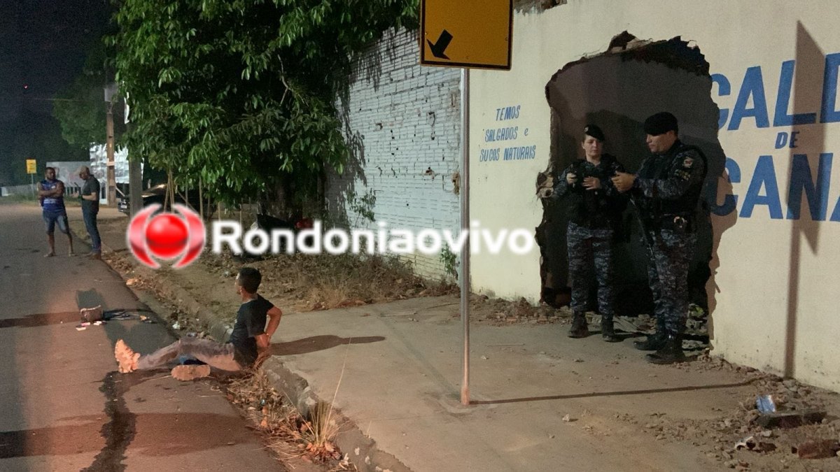 A dupla em uma moto roubada saiu em fuga de uma equipe da PM na região central. Já no cruzamento, o ladrão que conduzia a moto passou direto na Rua Rogério Weber e bateu contra um muro.