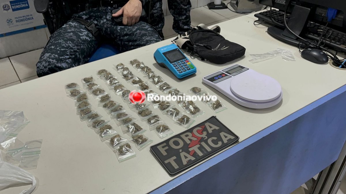 Durante revista no local, foram encontradas 53 porções de maconha, balança de precisão, sacos para embalar drogas e uma máquina de passar cartão onde eram feitas parte das vendas de maconha.