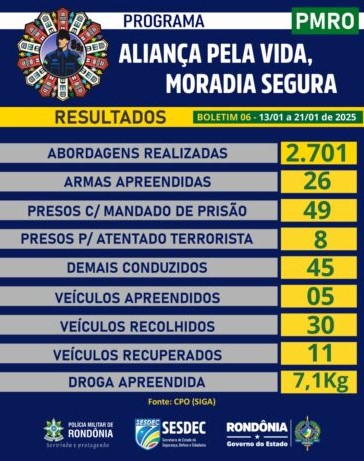 O governo de Rondônia divulgou, nesta quarta-feira (22), o balanço das ações de segurança pública. Os esforços integram uma ampla estratégia para intensificar o enfrentamento à criminalidade, desarticular grupos criminosos e garantir a segurança dos cidadãos em todo o estado.
