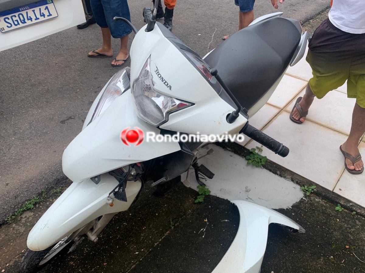 A mulher em uma motocicleta Honda Biz seguia pela Rua Bidú Saião, quando o motorista do carro saiu do estacionamento e acabou provocando o acidente.