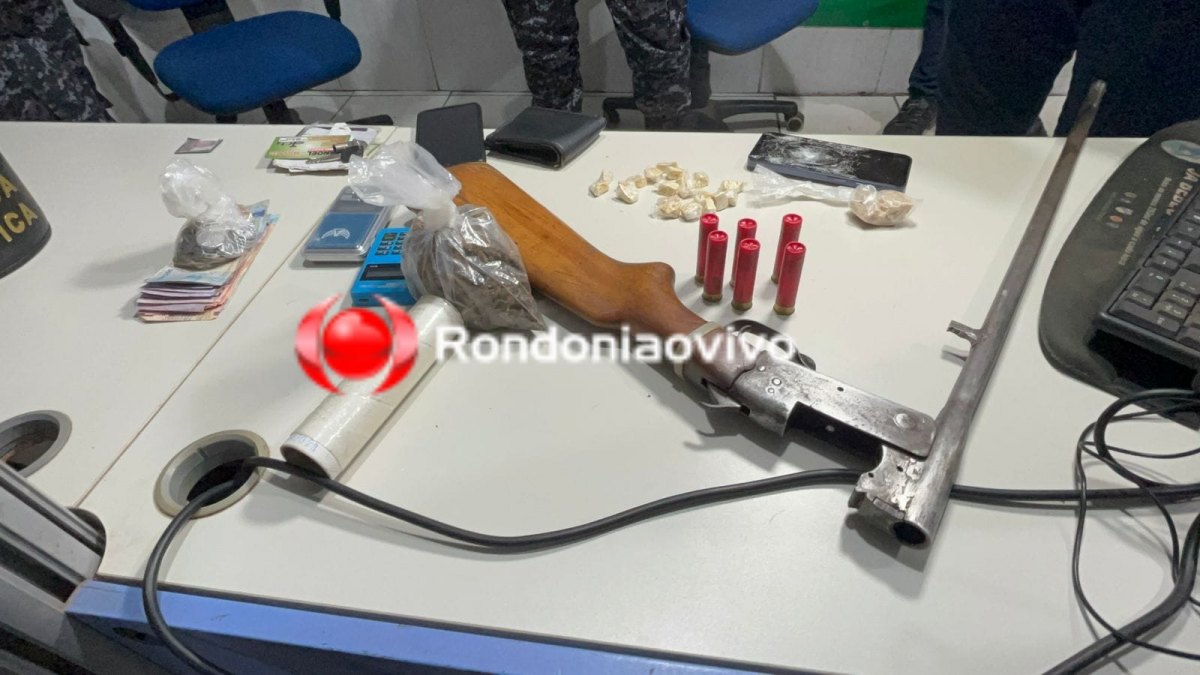 Dentro da casa, os policiais encontraram uma espingarda calibre 28 e mais porções de drogas escondidas em um freezer.