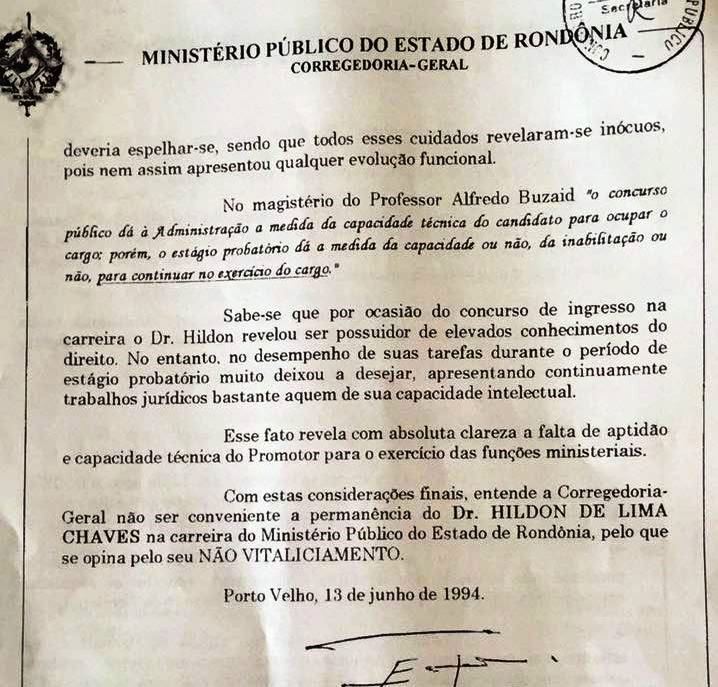 Em relatório final da Corregedoria do Ministério Público, datado de 13 de junho de 1994, sobre o estágio probatório do então recém-empossado Hildon Chaves, sua conduta como “fiscal diligente da lei” foi reprovada, com a recomendação que o mesmo não fosse declarado ‘vitalício’ no cargo.