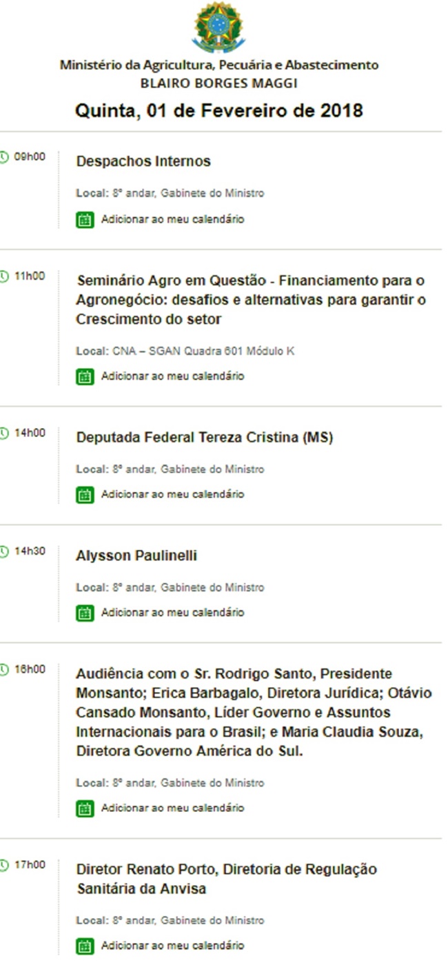 No dia 1º, o ministro da Agricultura, Blairo Maggi, se reuniu com o presidente da Monsanto no Brasil, Rodrigo Santos, acompanhado de diretores da área jurídica e de negócios da multinacional, conforme cópia da agenda no final desta reportagem. No mesmo dia, pela manhã, esteve com ruralistas em um seminário que discutiu desafios e alternativas para garantir o crescimento do agronegócio.