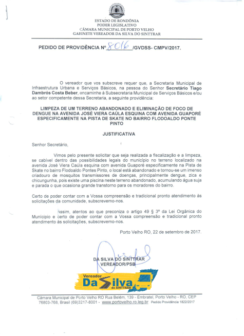O Vereador Da Silva Do Sinttrar, realizou pedido de providência, em atendimento a necessidade da população que utiliza diariamente a Pista de Caminhada (Pista do Skate), que fica localizada na esquina das Avenidas Guaporé com José Vieira Caúla no bairro Cuniã. A vegetação ao redor da pista, já estava muito alta, e necessitava de uma manutenção para que a segurança das pessoas que ali se exercitam, não fosse comprometida.