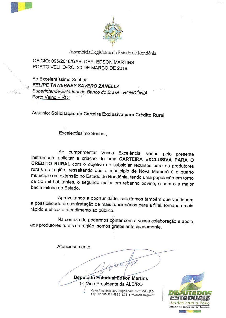Laerte Queiroz informou a Edson Martins a necessidade da criação de uma carteira exclusiva para o crédito rural na filial do Banco do Brasil naquela cidade. Nova Mamoré tem aproximadamente 30 mil habitantes e é o segundo maior em rebanho bovino do Estado, com a maior bacia leiteira.