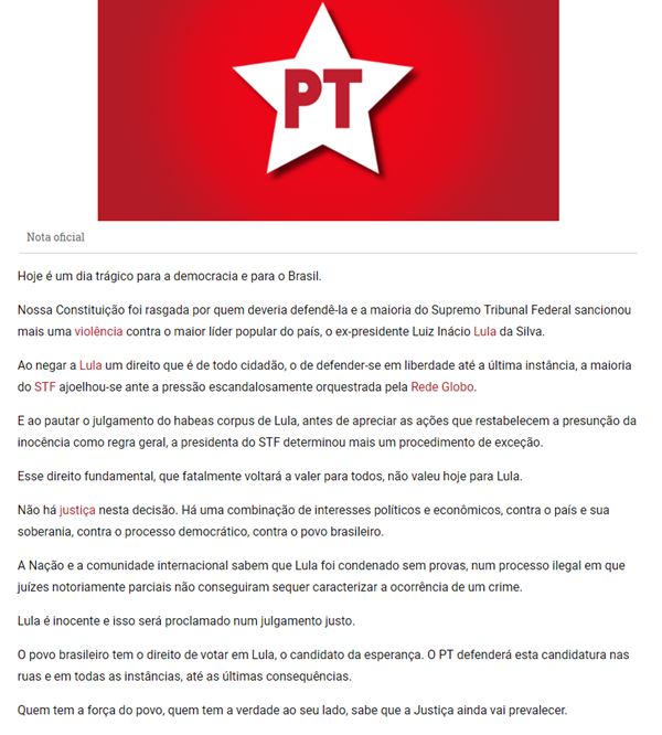 “Isso foi para tentar tirar o Lula da eleição, mas podemos registrar a candidatura dele, mesmo preso. Acredito que Lula vai ficar pouco tempo na prisão”, afirmou o deputado estadual José Américo Dias (PT). Nota publicada no site da legenda, já na madrugada desta quinta-feira (05), dava o tom dessa estratégia. No texto, a sigla destaca “o dia trágico para a democracia”, exalta que a “Constituição foi rasgada” e reafirma a inocência do líder petista (veja abaixo):