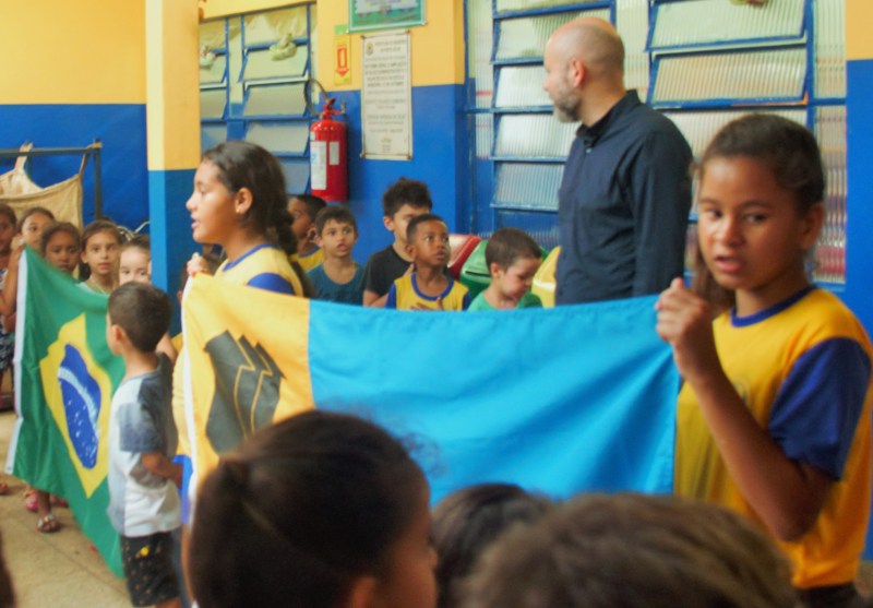 No dia nove de março, o Professor Aleks Palitot, já conhecedor da realidade vivenciada por alunos e professores levou uma bandeira do Brasil para doar a unidade escolar. Foi nesta sexta a primeira visita do vereador à escola e foi durante o momento cívico que aconteceu o primeiro contato entre Kaleb e Aleks.