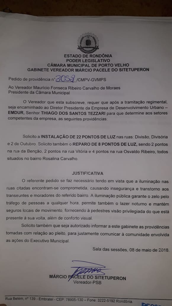 O trabalho é em atendimento ao pedido de providência nº 3054/2018, de autoria do vereador Márcio Pacele do Sitetuperon, protocolado no início do mês passado, na Mesa Diretora da Câmara Municipal.
