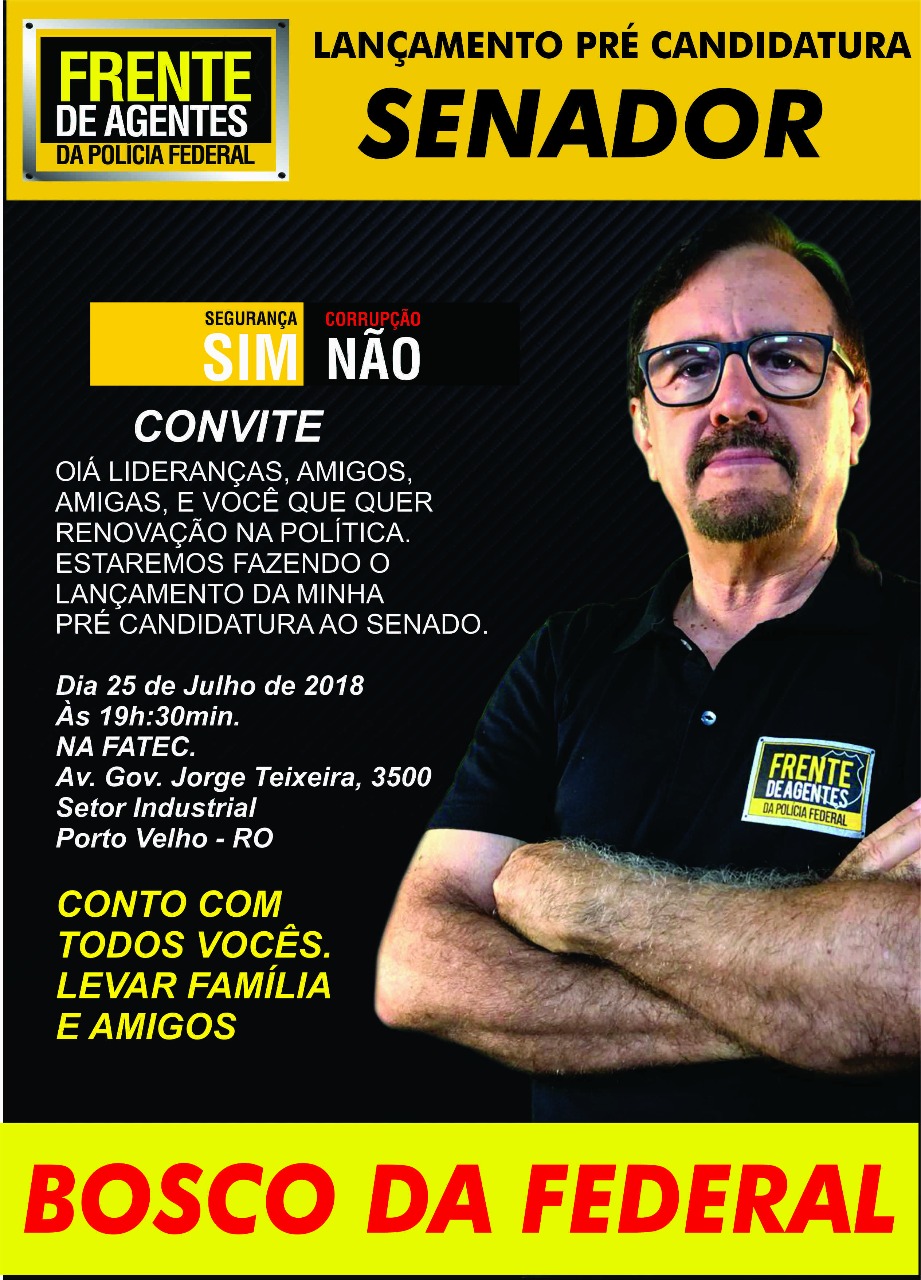 Hoje a partir das 19h30, no auditório da Fatec, situado a avenida Governador Jorge Teixeira, 3500, Setor Industrial em Porto Velho, acontece uma reunião para o lançamento da pré-candidatura ao Senado Federal João Bosco Costa, conhecido por “Bosco da Federal”.