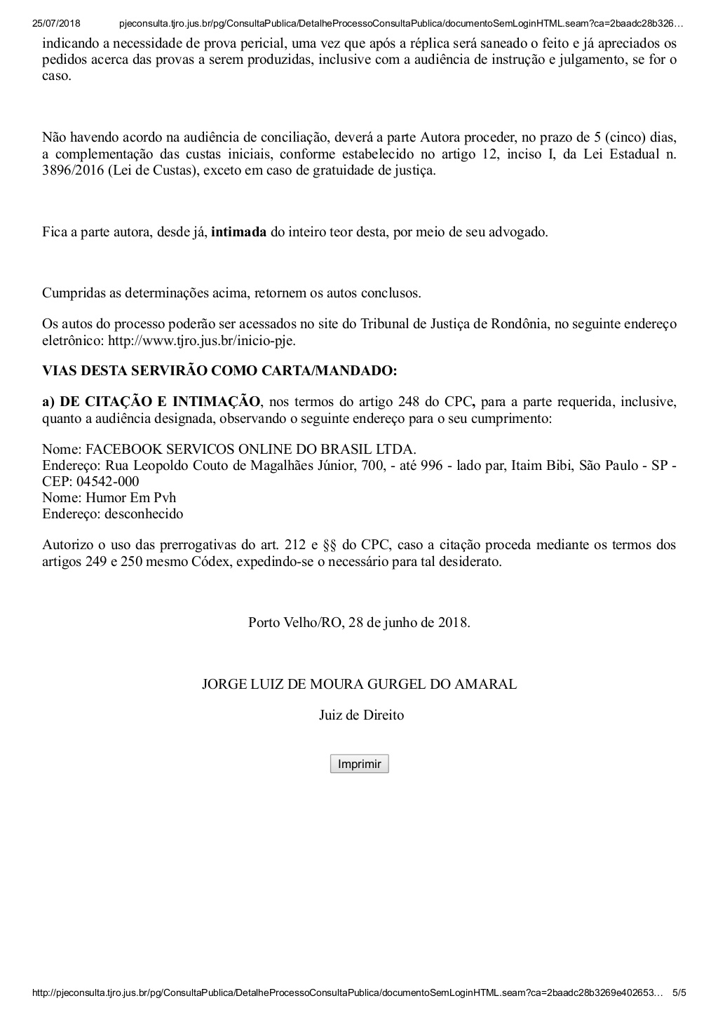 Além disso, a rede social terá de apresentar outras informações que possam contribuir para a identificação dos responsáveis pelas postagens realizadas pela página. Foi concedido, para isso, prazo de 5 dias, contados a partir do recebimento do AR [Aviso de Recebimento], sob pena de multa diária de mil reais.