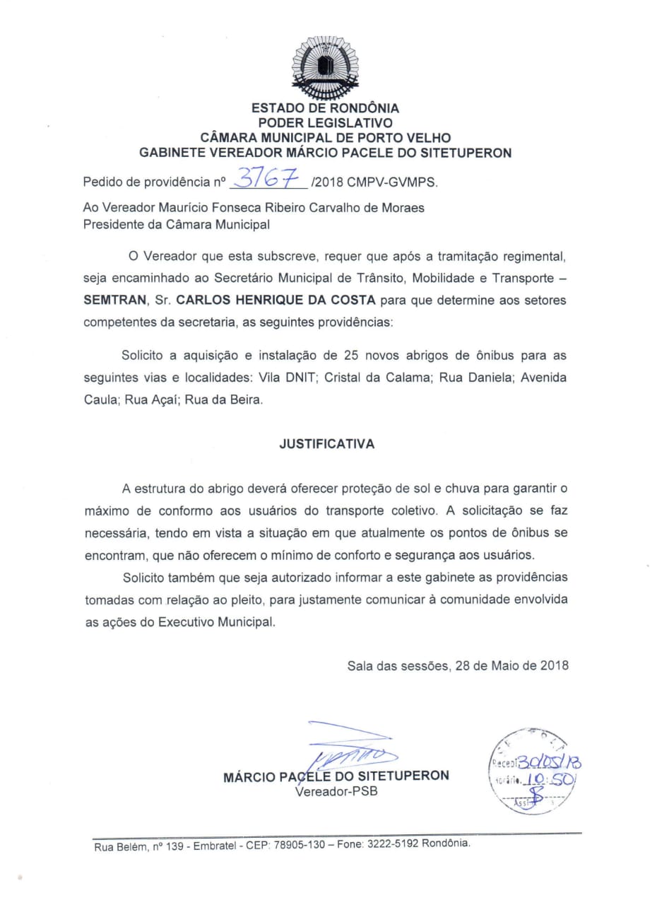 A obra é resultado do pedido de autoria do vereador, atendido pela prefeitura de Porto Velho. O objetivo é evitar que as pessoas que utilizam o transporte público não fiquem espostos ao sol e a chuva.