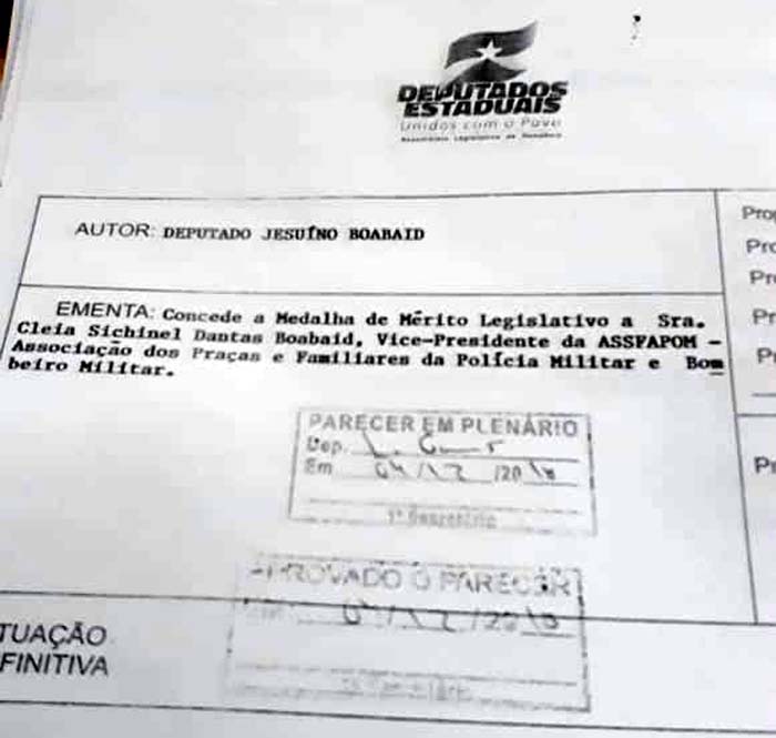 O ainda deputado Jesuíno Boabaid, do PMN, resolveu condecorar a própria esposa Ada Dantas, vereadora de Porto Velho eleita pela mesma legenda, com medalha de Mérito Legislativo. Jesuíno não foi reeleito.