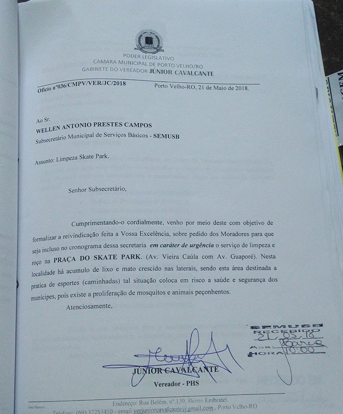 Por meio de Pedidos de Providencias, em parceria com a Prefeitura, o Vereador Júnior Cavalcante vem contribuindo para melhoria de nossa Capital, como por exemplo, o Skate Park que é uma área destinada ao esporte e lazer para jovens, idosos e famílias, desta forma sendo imprescindíveis os cuidados e a manutenção do local. Dentre os pedidos feitos por este Parlamentar há o de Revitalização do Skate Park e outros.
