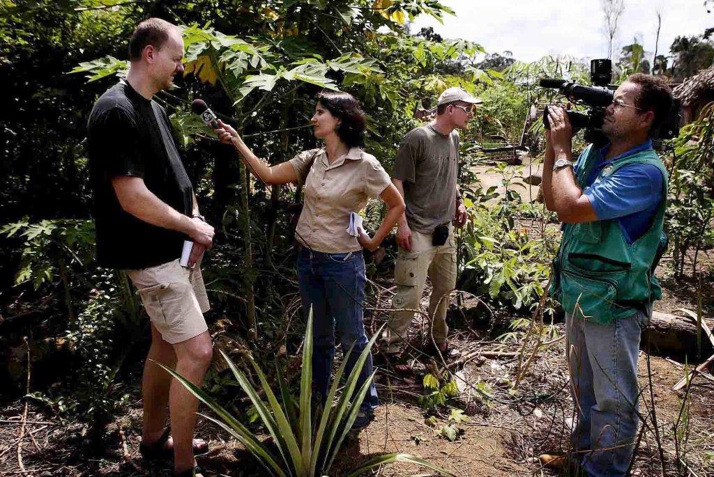 Jornalistas dinamarqueses ficaram uma semana em Rondônia visitando aldeias indígenas. Os profissionais de imprensa queriam saber quais os efeitos das mudanças climáticas na vida das comunidades indígenas. Eles também questionaram sobre desmatamento e ouviram dos índios que os povos das águas estão nervosos com homem branco que devasta a natureza. De acordo com os indígenas os povos das águas estão aborrecidos e tem se rebelado provocando verões intensos com longo período de seca e inverno com excesso de água. Os jornalistas estiveram na Aldeia dos Gaviões, localizada distante cerca de 50 quilômetros de Ji-Paraná região central do estado. 15 anos atrás esses jornalistas estiveram em Rondônia. Nessa expedição de agora eles foram acompanhados pelo Repórter Cinematográfico e Professor de Inglês, Ailton Lemos, que atuou como tradutor para os dinamarqueses. Essa foto, tirada em 2004, mostra Aílton filmando os jornalistas quando trabalhava para a Tv Rondônia.