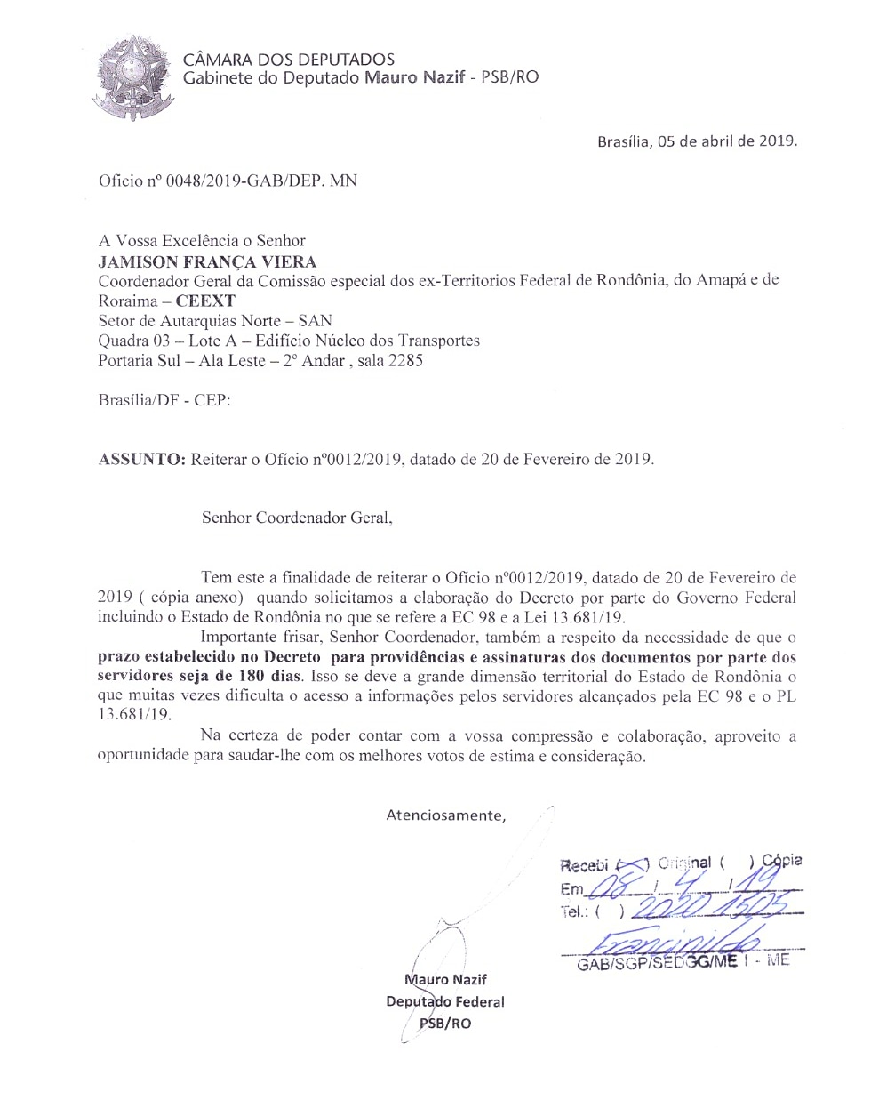 O Deputado Mauro Nazif protocola junto ao Ministério da Economia, através do Coordenador Jamison França Viera, a publicação de decreto que contempla o estado de RO na transposição e também que seja estabelecido prazo de 180 dias para que os servidores possam tomar as devidas providências e assinaturas de documentos.