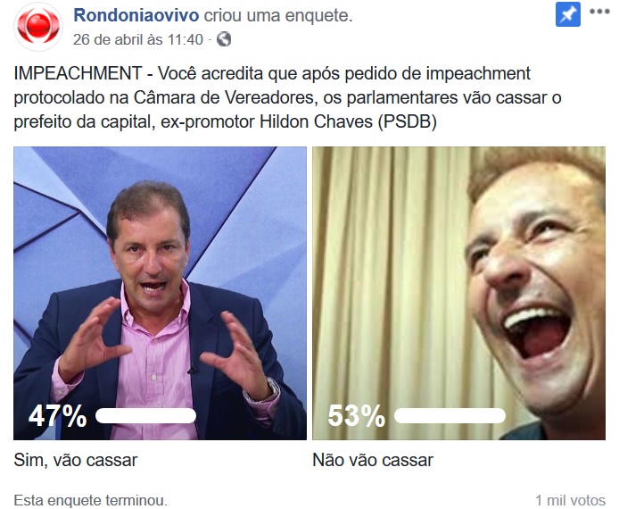 A enquete foi feita nos dias 24 e 25 de abril e ao todo 1028 leitores do site responderam, sendo que 481 acreditam que os vereadores vão cassar o prefeito e 547 de que ele não será cassado. Ou seja, 47% acreditam na cassação e 53 % duvidam que isso ocorra. O Rondoniavivo lembra que só é permitido ao internauta, votar uma única vez. Isso evita que uma mesma pessoa ou um robô vote várias vezes.