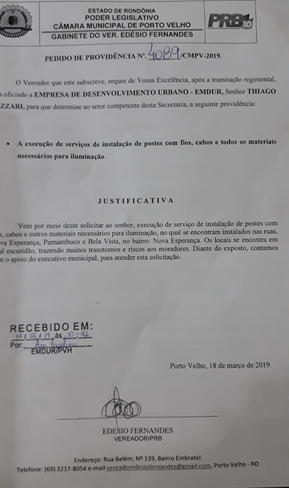 O pedido de iluminação para o bairro Nova Esperança foi feito através da equipe do vereador Edesio Fernandes, que vistou a comunidade, e percebeu que estava totalmente na escuridão.