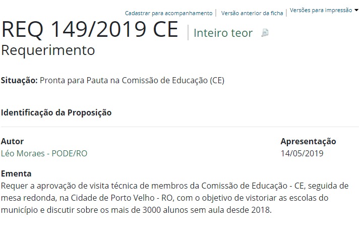 No último dia 14 de maio foi encaminhado o requerimento 149/2019 de autoria do deputado federal Leo Moraes (PODE) pedindo uma visita técnica da Comissão da Educação do Congresso Nacional, além da formação de mesa redonda dos parlamentares para discutir a situação de cerca de 3000 crianças prejudicadas.