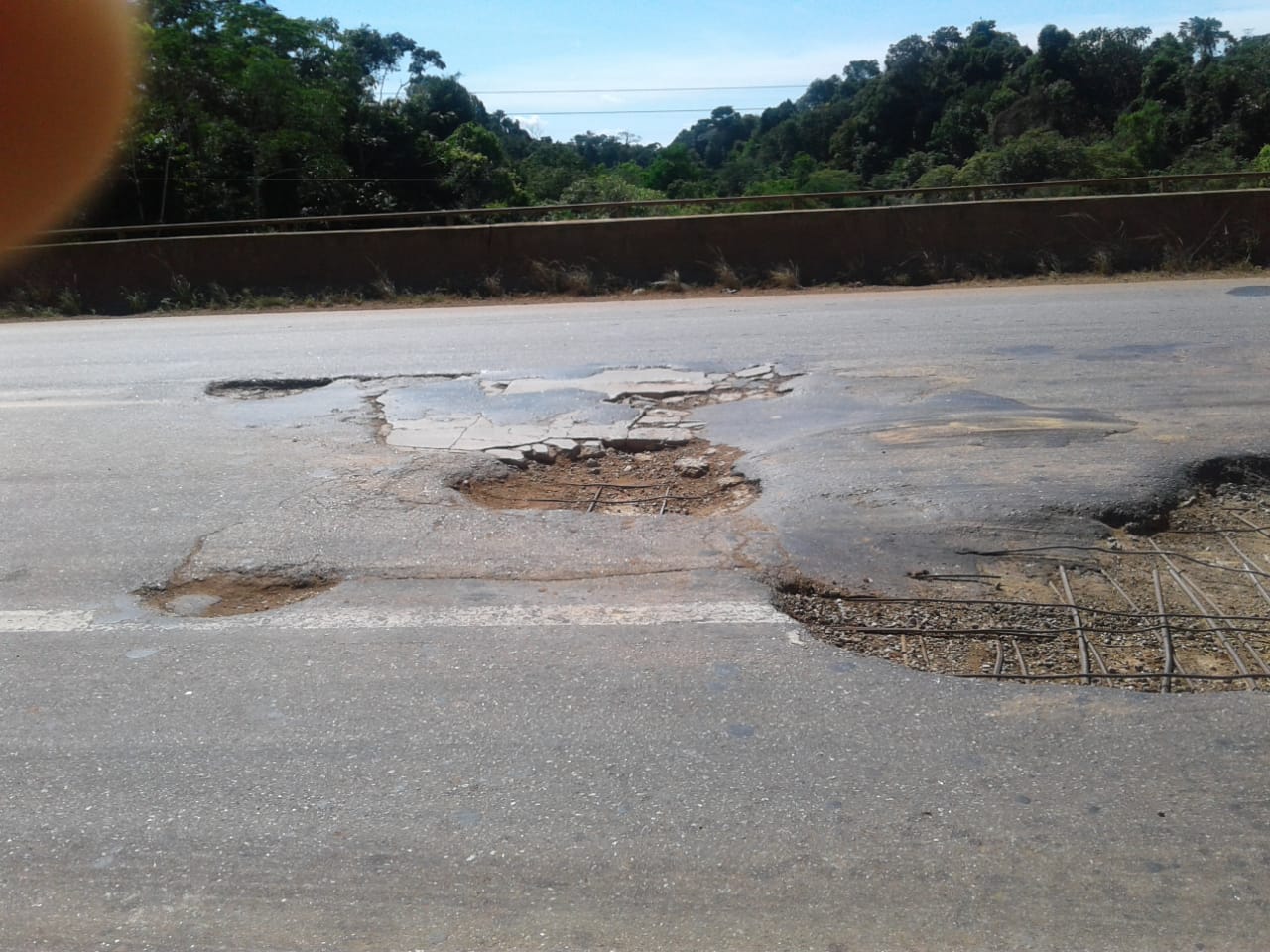 As fotos mostram uma situação absurda registrada na pista da ponte da Jacutinga, na BR-364, entre os municípios de Candeias do Jamari e Itapuã do Oeste. Motoristas procuraram o Rondoniaovivo para denúnciar o perigo no local. O asfalto desapareceu ocasionando uma cratera e deixando à mostra vigas de ferro que sustentam a estrutura e até a armação de concreto que serve como base. Além dos prejuízos materiais que os buracos podem causar existe o sério risco de acidente com motoristas que tentam desviar bruscamente quando se deparam com as crateras.
