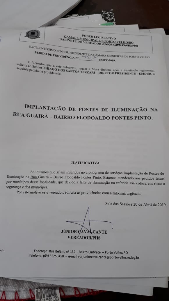 A EMDUR vem se destacando como uma das pastas mais atuantes da Prefeitura de Porto Velho, porém, as demandas de iluminação pública são recorrentes e muitos espaços ainda precisam deste serviço, tendo em vista a taxa de iluminação que é cobrado mensalmente nas contas de luz da população.