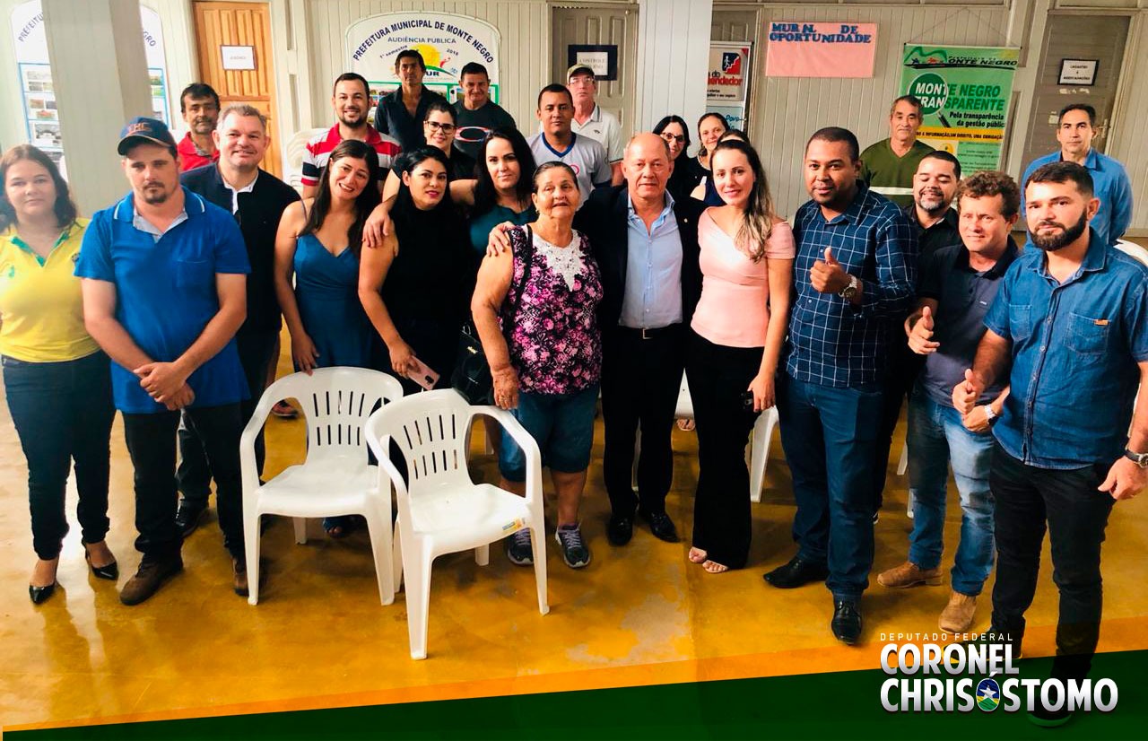 Em reunião com prefeito Evandro Marques, secretários e munícipes em Monte Negro, neste sábado (08), o deputado federal Coronel Chrisostomo, atendendo ao pedido do prefeito, empenhou recursos de emendas para as áreas de educação e saúde do município.