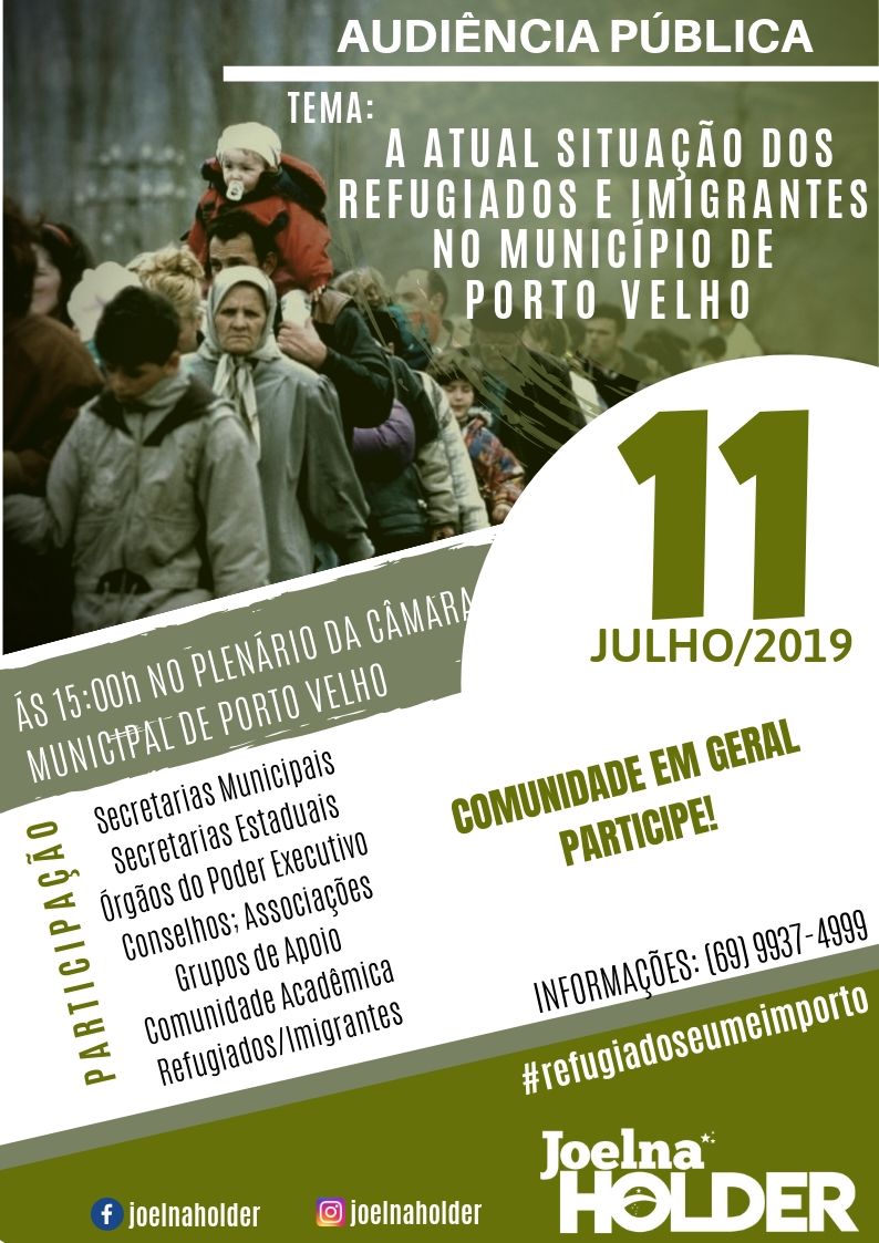 No dia 11 de julho, às 15h, a vereadora Joelna Holder promoverá, em parceria com o grupo Caritas, no Plenário da Câmara Municipal de Porto Velho, uma Audiência Pública para debater “A Atual situação dos Refugiados e Imigrantes no Município de Porto Velho”.