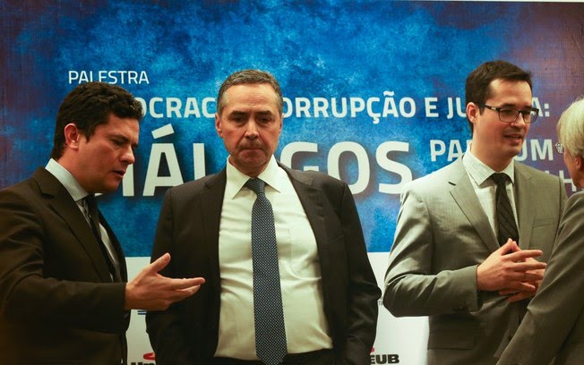 Sérgio Moro, Deltan Dallagnol e o ministro do STF, Luis Barroso no evento de comemorava o dos 05 anos da Operação Lava Jato em Brasília.