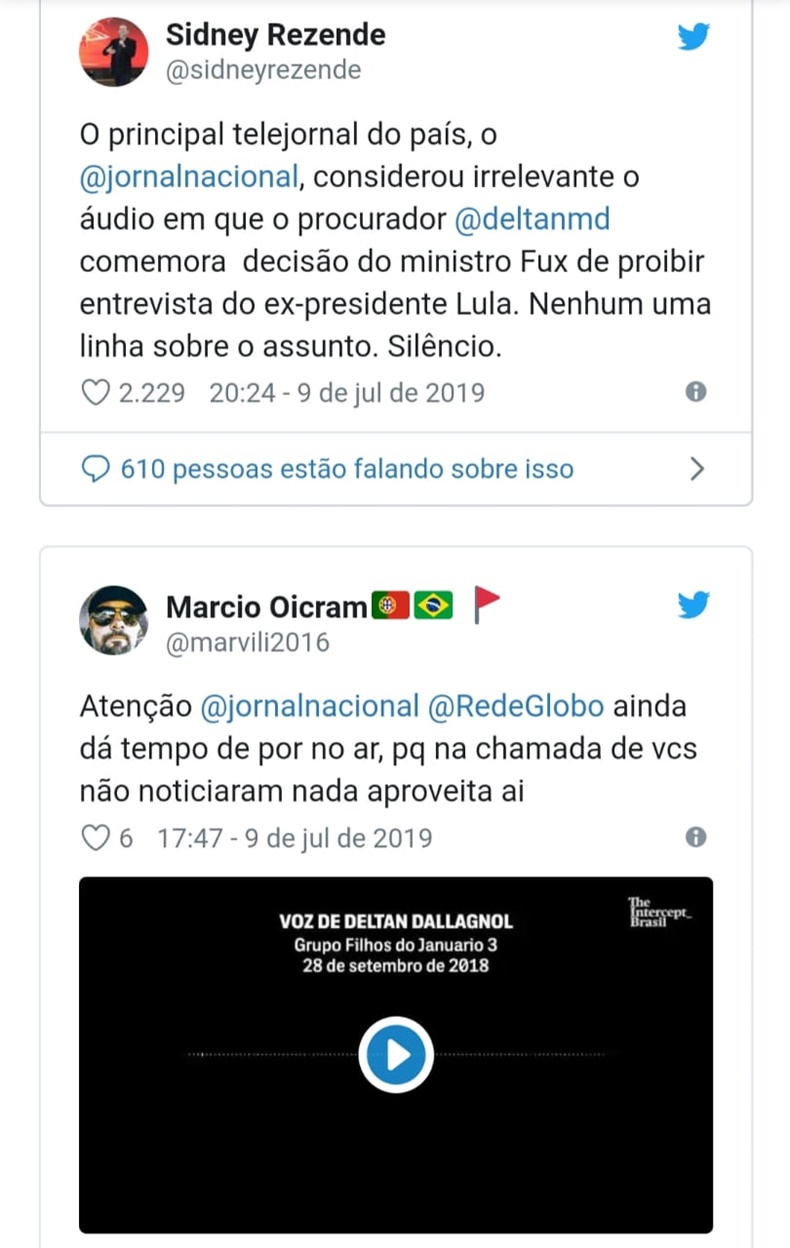 O JN da TV Globo preferiu seguir dando apoio à operação Lava Jato e decidiu ignorar a revelação feita nesta terça-feira, 9, pelo The Intercept, que mostrou pela primeira vez uma áudio em que o procurador Deltan Dallagnol celebra a decisão do ministro Luiz Fux que censurou a entrevista ao ex-presidente Lula durante a campanha eleitoral do ano passado.