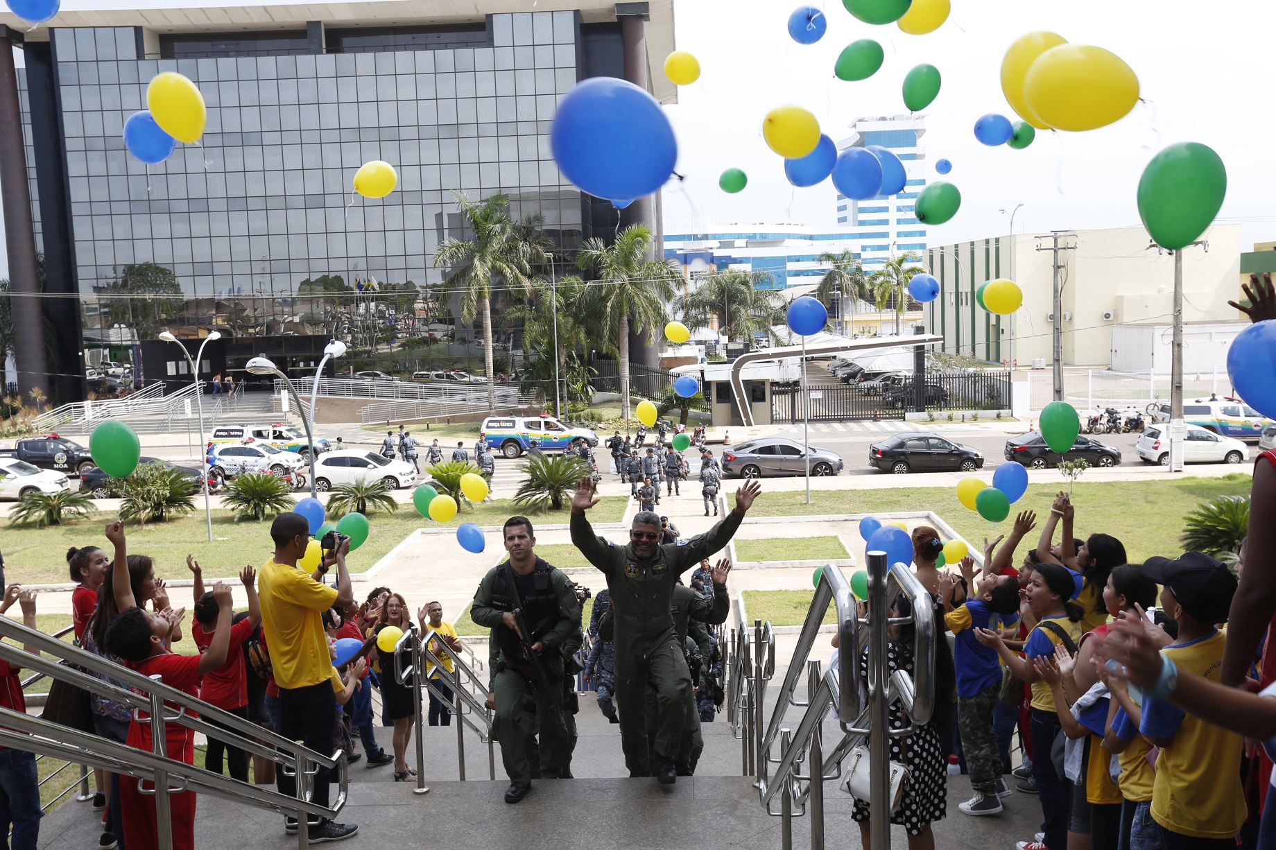 Após o pouso da aeronave, os homenageados foram em comboio marchando até a Assembleia Legislativa do Estado, onde foram recebidos na escadaria do prédio com muitos aplausos e com a soltura de balões coloridos.