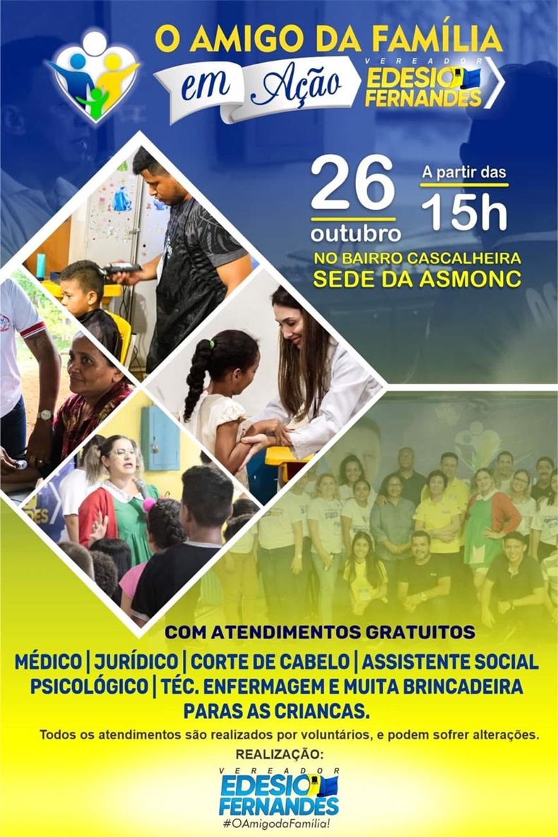 O evento acontece neste sábado Com atendimento: Médico, Tecnico de enfermagem, Jurídico, Assistente Social, Psicólogo, Corte de cabelo e em Especial ao Mês das Crianças com muitas brincadeiras, lanche e distribuição de presentes.