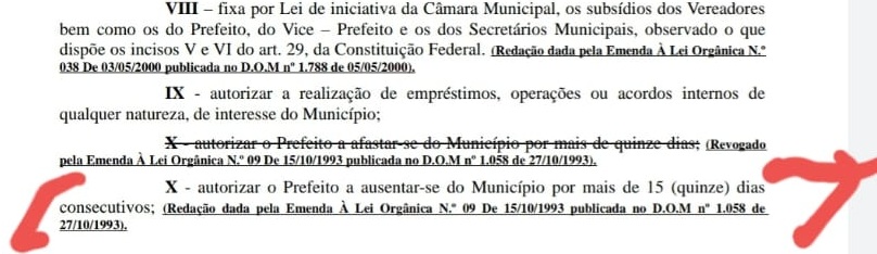De acordo com O Artigo 48 da Lei Orgânica do Município, em seu inciso X, o prefeito é obrigado a pedir permissão da Câmara de Vereadores para ficar mais que 15 dias fora da cidade.