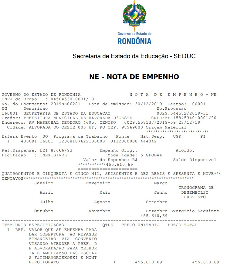 O Governo de Rondônia empenhou R$ 455.610,69 de emendas do presidente da Assembleia Legislativa, deputado Laerte Gomes, para atender a creche Fátima Azevedo e a Escola Monteiro Lobato no distrito de Terra Boa, ambas unidades educacionais localizadas no município de Alvorada do Oeste. O recurso será depositado nas contas da Prefeitura graças ao trabalho incansável do parlamentar em carrear recursos.