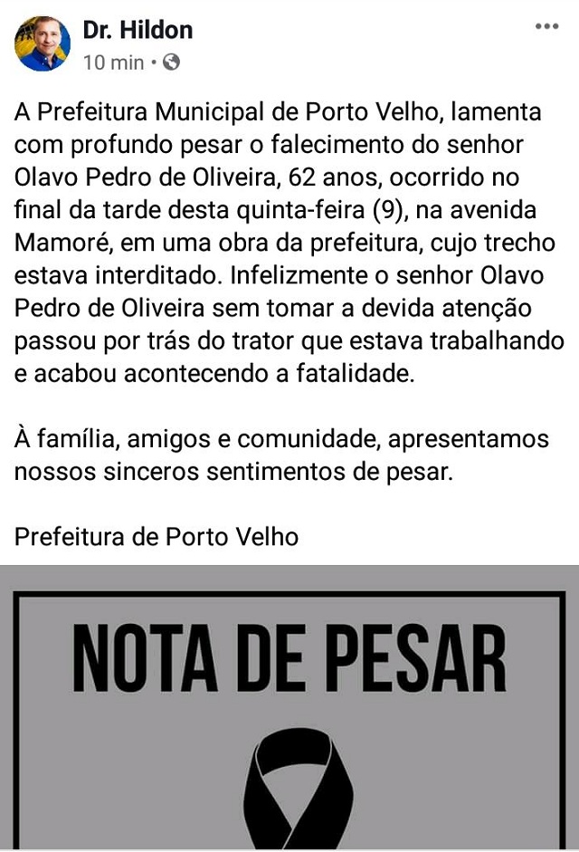 Prefeito Hildon Chaves (PSDB) compartilhou nota de pesar que culpou o próprio idoso por sua morte