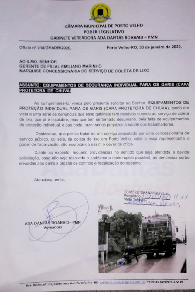 A vereadora encaminhou o ofício 018/2020 ao gerente de filial, Emiliano Marinho, da Marquise Concessionária de Coleta de Lixo, solicitando que seja disponibilizada capas para a proteção contra a chuva aos garis. “Por ser serviço realizado por uma concessionária de serviço público, cabe a mim, como vereadora, fiscalizar e buscar solução para que os trabalhadores possam executar seus serviços com mais dignidade”, finalizou a vereadora.