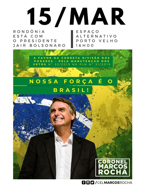 “Espero todos no 15 de Março, nas Ruas. Em Porto Velho a população está se organizando para sair do Espaço Alternativo. Vamos sempre com Deus! Sei que ele está abençoando esse novo momento. O trabalho sério e honesto erguerá nossa pátria para seu verdadeiro patamar”, disse Marcos Rocha.