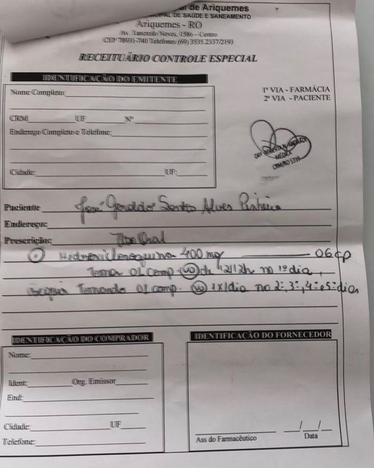 Nesta terça-feira (26) o deputado estadual Geraldo da Rondônia, que foi infectado pelo vírus, publicou em suas redes sociais os receituários médicos emitidos para sua recuperação e mostra que entre outros medicamentos, está a hidroxicloroquina.