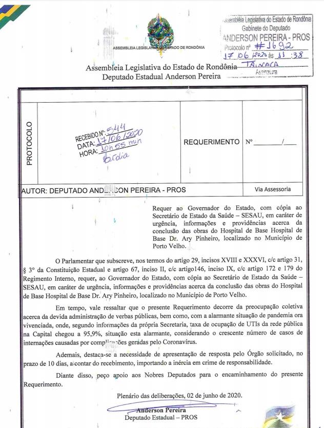 Temendo superlotação nas unidades de saúde publica e privada no Estado por conta da crise sanitária que o mundo atravessa, com a COVID19 – novo Coronavírus, o deputado Anderson Pereira cobrou a retomada das atividades no canteiro de obras, bem como a conclusão, questionando o executivo do porque da paralisação.