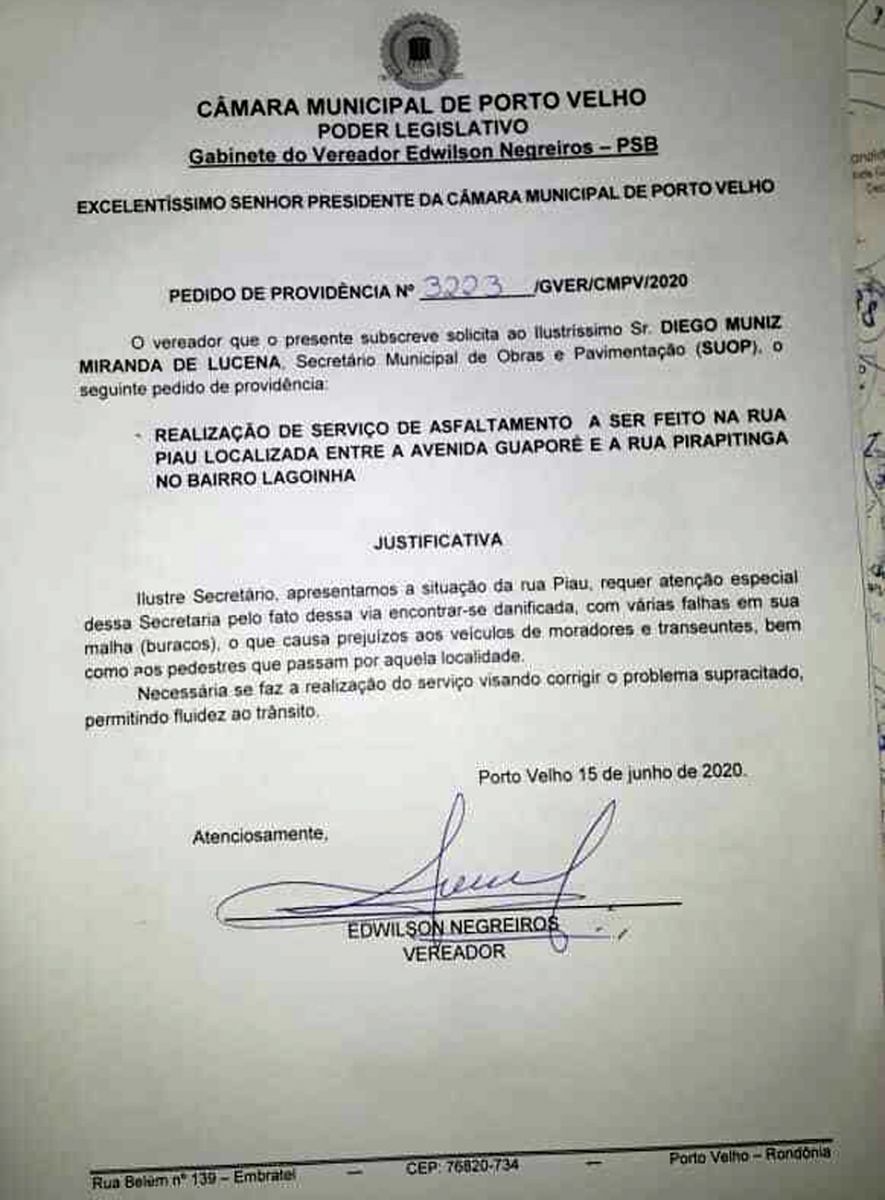 Em menos de 15 dias, a Prefeitura de Porto Velho, através da Secretaria de Obras e Pavimentação (SUOP), atendeu novo Pedido de Providências apresentado pelo vereador Edwilson Negreiros, do PSB.