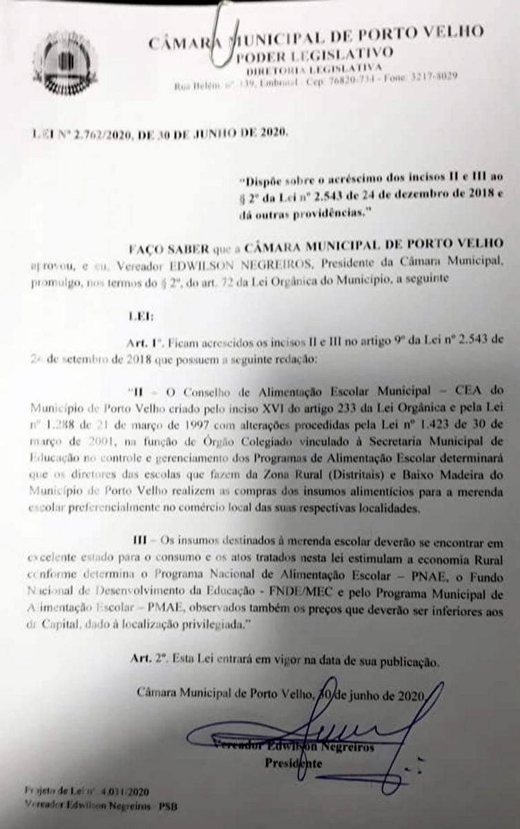 “Agora o Conselho de Alimentação Escolar Municipal (CEA) deve determinar que os diretores das escolas que fazem parte da Zona Rural e Baixo Madeira realizem as compras dos insumos alimentícios de merenda escolar preferencialmente no comércio local onde estão situadas as instituições de ensino”, pontuou.