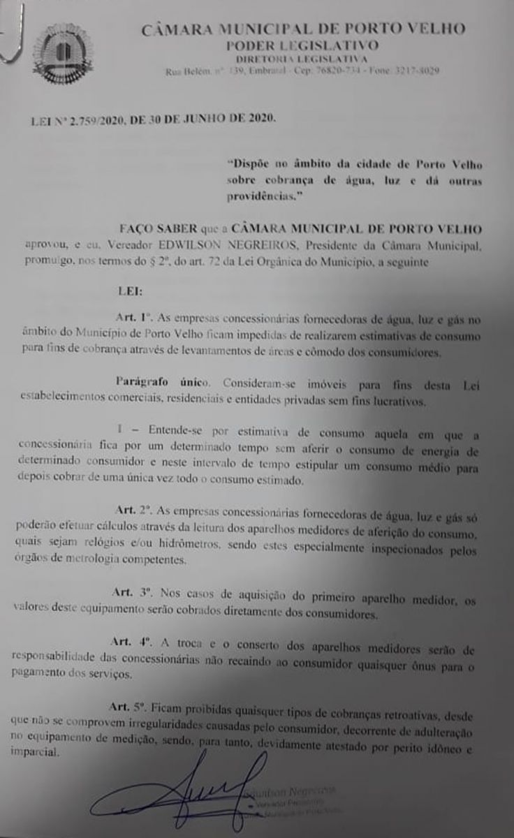 Sem a sanção do alcaide, Negreiros promulgou as leis da merenda e também a que proíbe concessionárias de luz, água e gás de patrocinarem cobranças por estimativa.