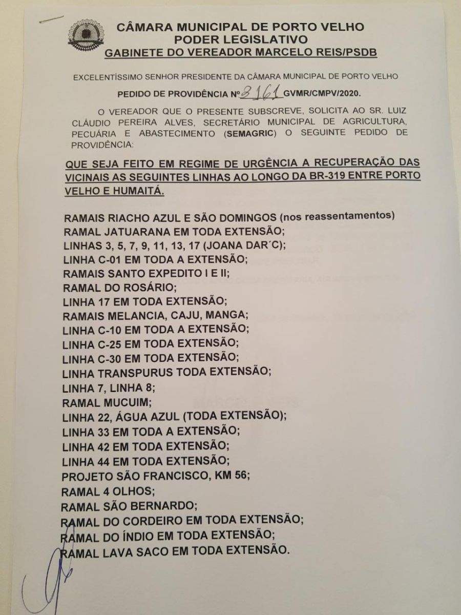 O vereador Marcelo Reis intermediou junto a prefeitura de Porto Velho o serviço de infraestrutura nas linhas, ramais e vicinais na área rural da capital ao longo da BR-319, que agora será cumprido em um calendário montado pela SEMAGRIC.
