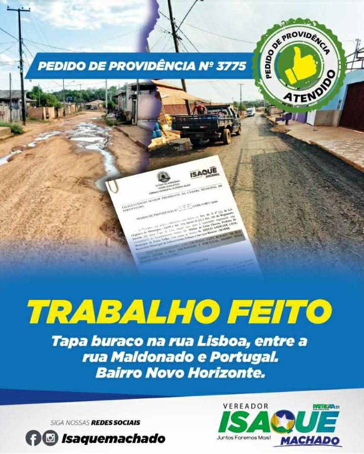 A equipe de tapa buracos do Município foi até a rua Lisboa e realizou o trabalho de reparação da pista. Esse é mais um das dezenas de pedidos de providências apresentados pelo vereador Isque Machado.