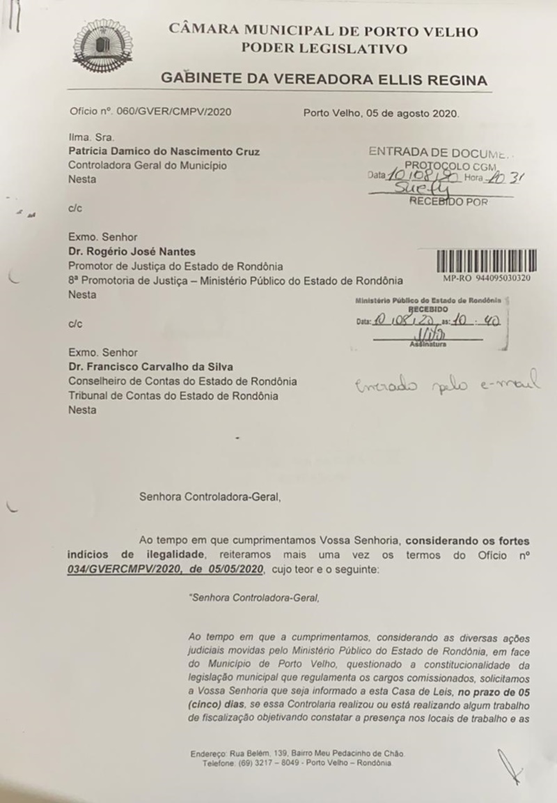 A vereadora Ellis Regina enviou à Controladoria-Geral do Município (CGM) ofício solicitando informações sobre a atual situação dos cargos comissionados da Prefeitura de Porto Velho.