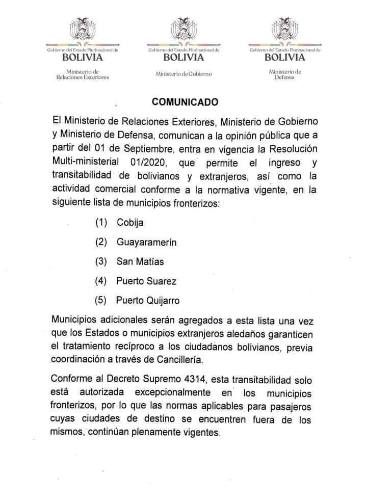 O governo boliviano autorizou a entrada e trânsito de cidadãos bolivianos e estrangeiros, bem como a reabertura da atividade comercial nos municípios de Cobija, Guayaramerín, San Matías, Puerto Suarez e Puerto Quijarro.