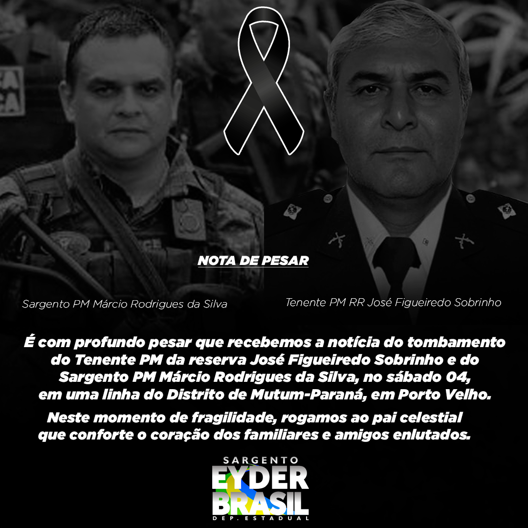 É com profundo pesar que recebemos a notícia do tombamento do Tenente PM da reserva José Figueiredo Sobrinho e do Sargento PM Márcio Rodrigues da Silva, no sábado 04, em uma linha do Distrito de Mutum-Paraná, em Porto Velho.