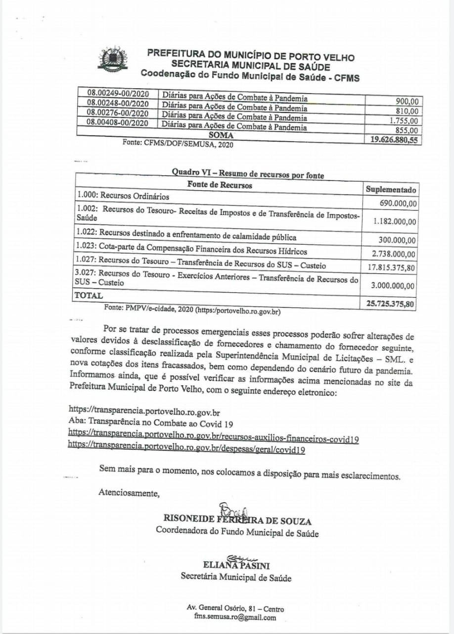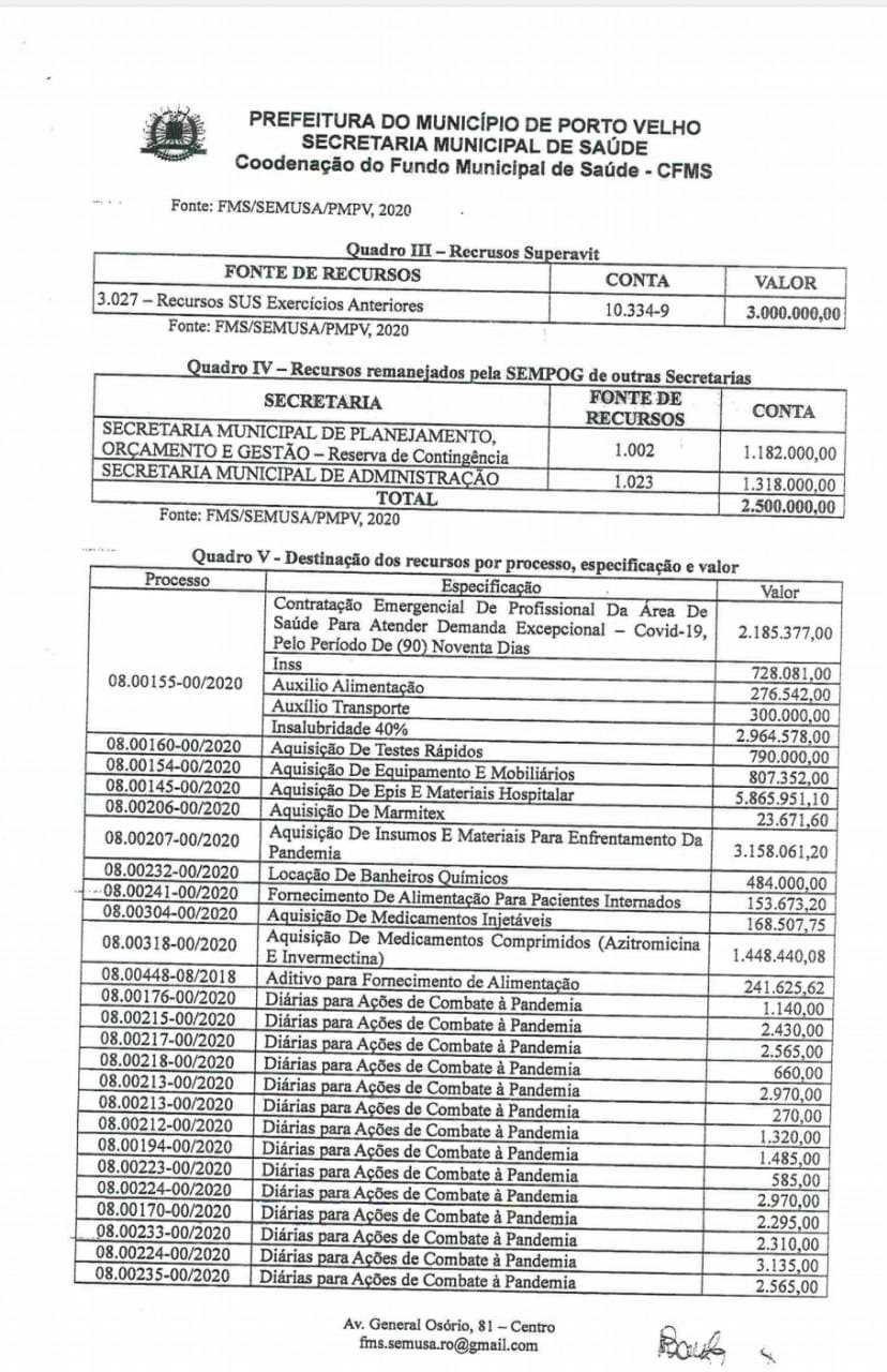 Atendendo solicitação feita pelo deputado Anderson Pereira (PROS), a Prefeitura de Porto Velho/SEMUSA encaminhou ao gabinete do parlamentar, ofício nº 5272, relatório contendo valores de receitas e despesas provenientes da pandemia da Covid19.
