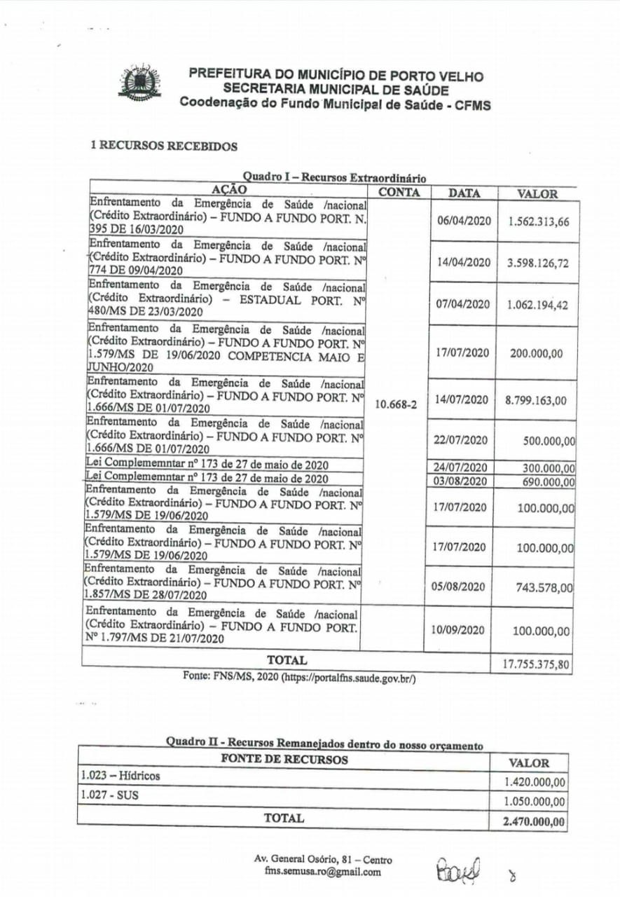 De acordo com executivo, os recursos federais destinados às ações de enfrentamento do Covid19 foram através das Portarias nº 356 de 11/09/2020 e 774 de 09/04/2020, depositados na conta corrente do Banco do Brasil da Prefeitura. Os recursos destinados pelo Governo do Estado de Rondônia foram liberados pelo Ministério da Saúde através da portaria 480/GAB/MS/2020, para esta ação e para obter maior transparência a Prefeitura abriu uma conta específica para recebimentos de recursos.